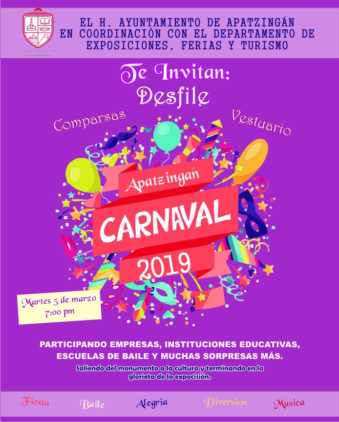 Apatzingán, Mich., Autoridades municipales, encabezadas por la presidente del DIF Municipal, Minerva Guízar Brito, invitaron a la población a ser parte del Carnaval 2019, que se desarrollará el próximo 05 de marzo en punto de las 19:00 horas.