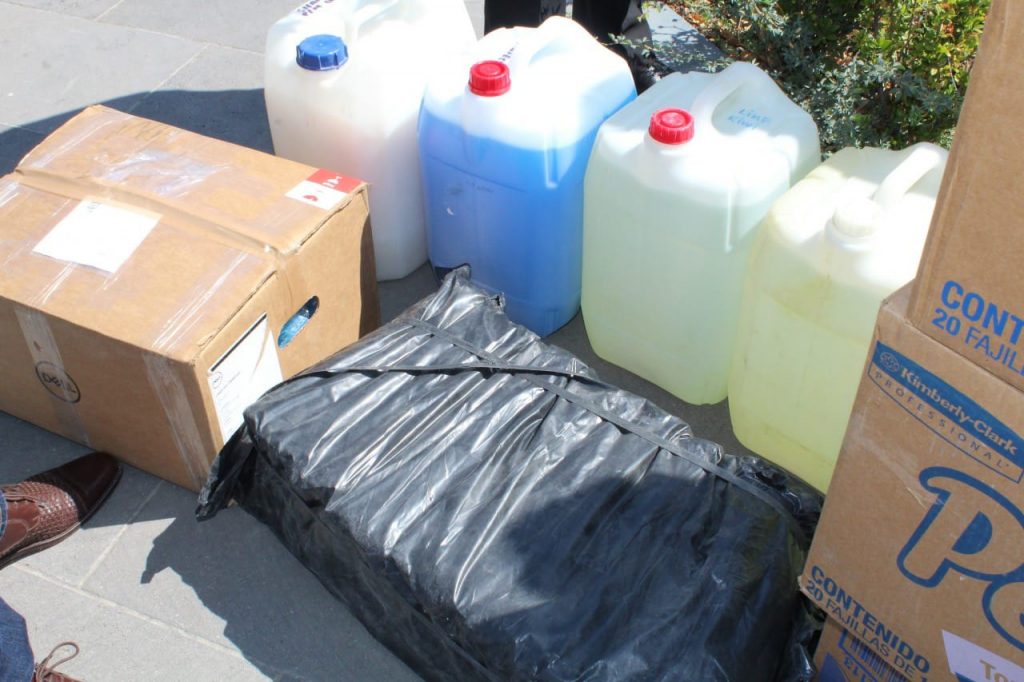 El paquete de materiales donados por el Legislador y la Regidora que fueron recibidos por el director del nosocomio Víctor Esparza Yáñez y el administrador Antonio Cabrera, incluyo, 100 caretas de protección facial, 60 cubrebocas N-95, 900 piezas de toalla interdoblada, 20 litros germilin, 20 litros sanitizante, un bulto de 25 kg de bolsa para basura, 100 litros de cloro, 20 litros de shampoo anti bacterial para manos, y 5 cajas de guantes estériles.