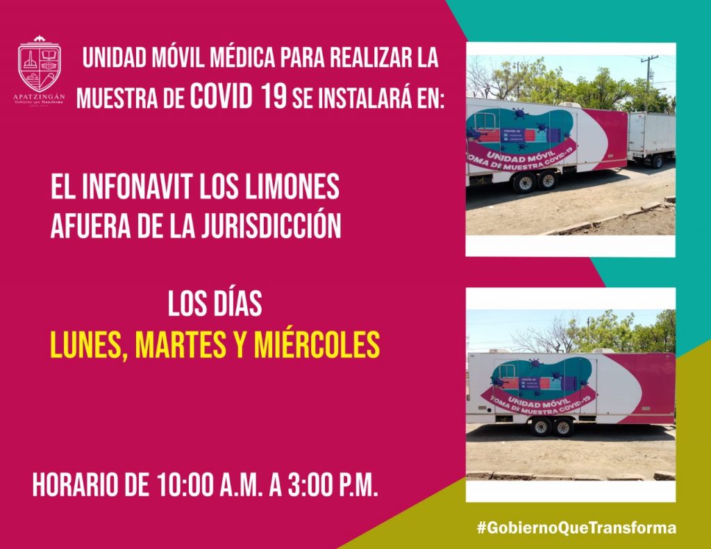 Apatzingán, Mich.- Con la finalidad de seguir atendiendo pacientes con enfermedades respiratorias que puedan resultar positivos al nuevo Coronavirus, la Unidad Médica Móvil de la Secretaría de Salud, se mantendrá por tres días en el Infonavit Los Limones, afuera de las instalaciones de la Séptima Jurisdicción Sanitaria.