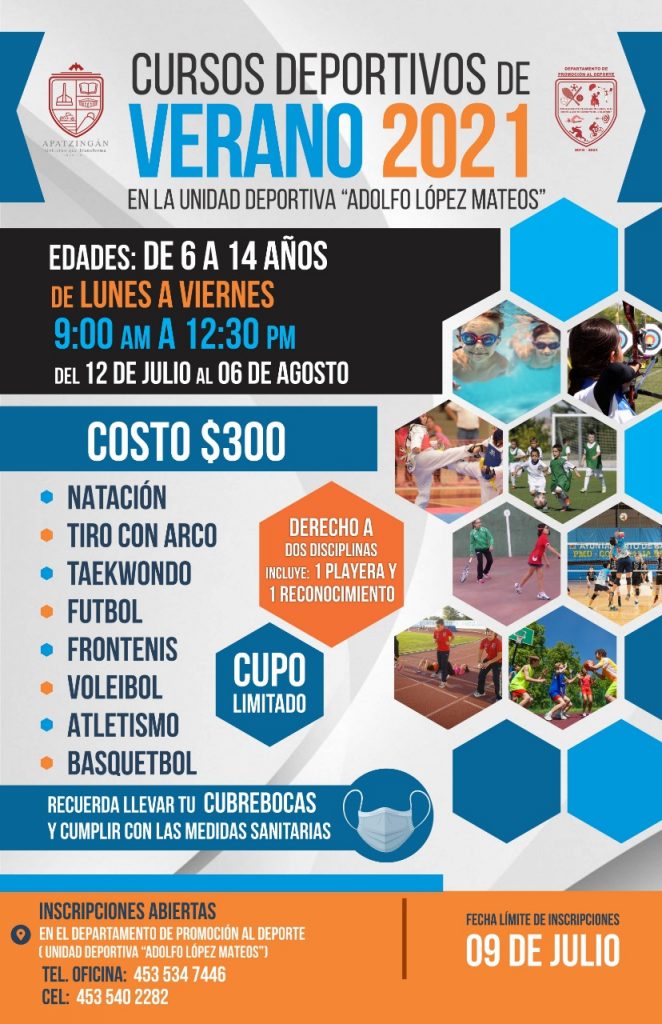 Apatzingán, Mich., El departamento de Promoción al Deporte, abrió las inscripciones para los cursos de verano 2021 para menores de edad, que se llevarán a cabo en las instalaciones de la Unidad Deportiva del 12 de julio al 6 de agosto.