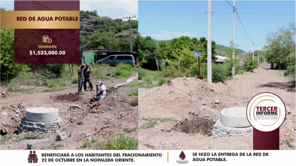 En ese sentido, el gobierno municipal que encabeza el alcalde, José Luis Cruz Lucatero, construyó dos redes de agua potable, la primera en la comunidad de Rancho Seco y la segunda en el Fraccionamiento 22 de octubre, en las que se hizo una inversión de 2 millones 523 mil pesos.