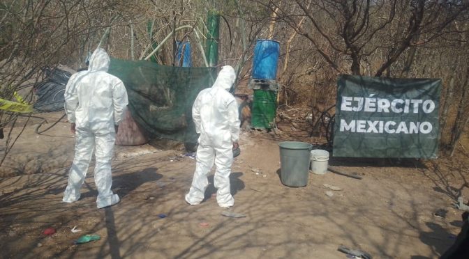 Apatzingán, Mich., La Secretaría de laDefensa Nacional, la Guardia Nacional y la Policía Michoacán, hace del conocimiento que en el marco de la “Plan Nacional de Paz y Seguridad 2018-2024” con el ingreso de cerca de 500 elementos del Ejército Mexicano, Guardia Nacional, Policía Michoacán y Fiscalía General del Estado y como resultado de las actividades realizadas el pasado 11 mayo 2022 en Nueva Italia, Mpio. de Múgica, Lombardía, Mpio. de Gabriel Zamora, Cupuan del Rio, Mpio. de la Huacana y Gral. Francisco Villa,Mpio. de Tumbiscatio, Mich., se llevó a cabo la localización y destrucción de diversos plantíos de marihuana y laboratorios para la elaboración de drogas sintéticas.