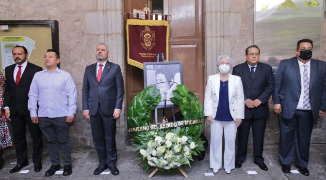 El homenaje estuvo acompañado también por el secretario de Gobierno, Carlos Torres Piña; el presidente del Tribunal Electoral del Estado de Michoacán, Salvador Alejandro Pérez Contreras y la directora de la Facultad de Derecho y Ciencias Sociales, Tania Haideé Torres Chávez; así como autoridades universitarias, y funcionarios estatales y federales.