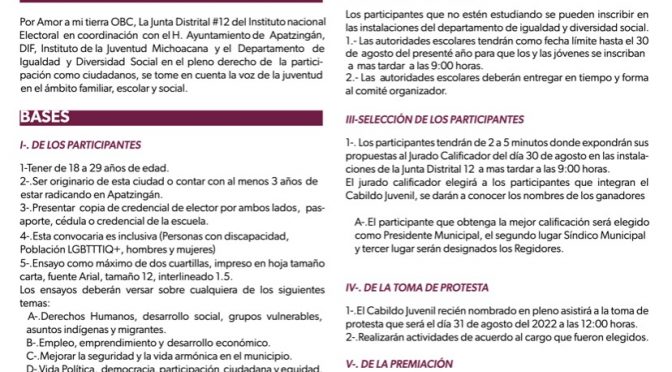 Apatzingán, Mich.- El Departamento de Igualdad y Diversidad Social, exhorta a los jóvenes a participar en el Cabildo Juvenil 2022, con la finalidad de que expresen sus preocupaciones y ayudar a través de propuestas a tener una mejor ciudad.