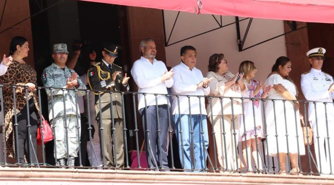 Desde el balcón presidencial en las instalaciones de la alcaldía municipal el desfile fue presidido por el presidente municipal, José Luis Cruz Lucatero, el gobernador del Estado, Alfredo Ramírez Bedolla y autoridades militares.