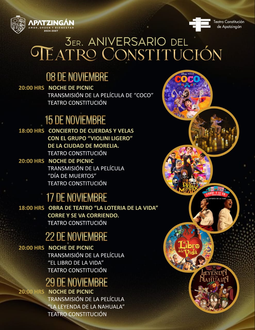 Apatzingán, Mich., Este mes de noviembre el Teatro Constitución celebra su tercer aniversario, por lo que tienen preparada una cartelera para toda la familia, el día 15 de presenta “violini ligero”, un cuarteto de cuerdas con música clásica así como covers de artistas como Adele entre otros, rodeados de velas, para el Domingo17 de Noviembre …