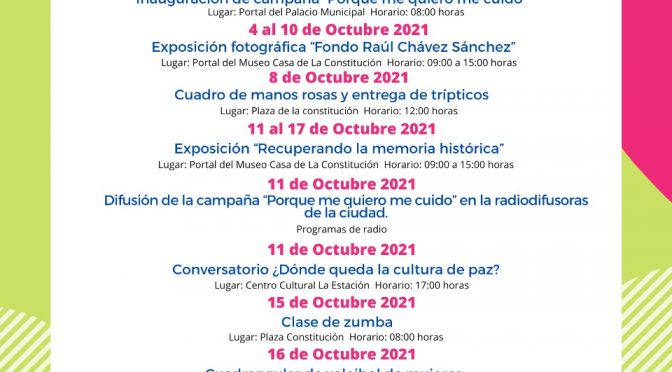 • La Dirección de la Mujer continuará las actividades de concientización. Apatzingán, Mich., La Dirección de la Mujer, alista diversas actividades para conmemorar el mes de la lucha contra el cáncer de mama, a través de la campaña “Porque me quiero, me cuido”, informó la titular de la dependencia, Nuelcia Endi Herrera Estrada. Al respecto …